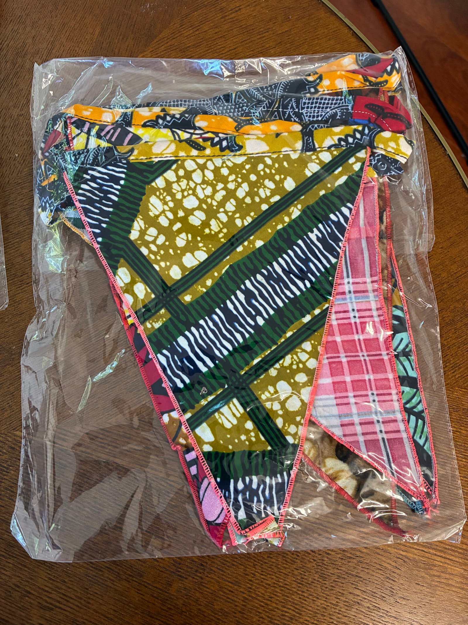 Each flag garland is unique, featuring a mix of bold prints and patterns inspired by African textiles.